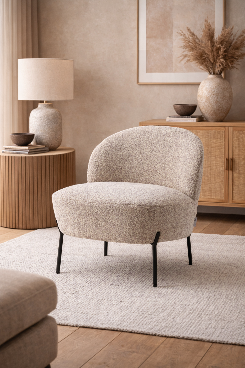 De Baudin fauteuil in Teddy is een elegante en compacte fauteuil die comfort en modern design perfect combineert. De zachte Alpine teddy stof in een warme ivoorkleur, een koele steel kleur en in de kleur naturel geeft de stoel een rustige en luxe uitstraling, terwijl het zwarte onderstel zorgt voor een stijlvol contrast.