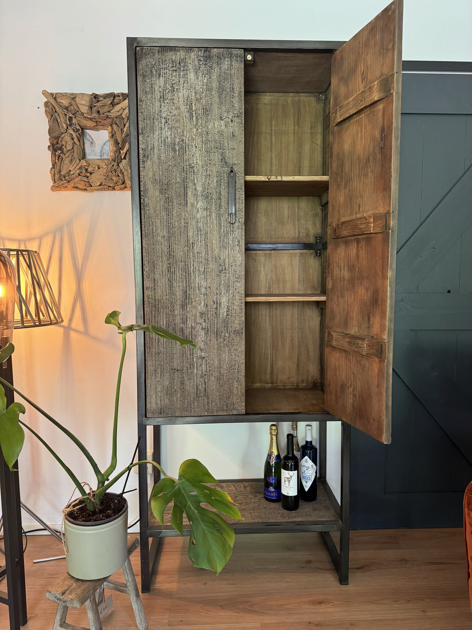 De kast heeft een stoere look, en is zeer gedetailleerd afgewerkt. Het stalen frame sluit nauwlettend aan op het robuuste hout en door de donkere beits is er een speelse diepte gecreëerd.