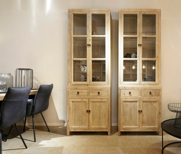 Landelijke bergkast Nena Naturel heeft 4 deurtjes, 2 schuiflades en 3 legplanken in de vitrine. Het oppervlak van het hout heeft een mooie voelbare nerf structuur. De afmetingen van de kast zijn breed 78 x hoog 226 x diep 50/43 cm.