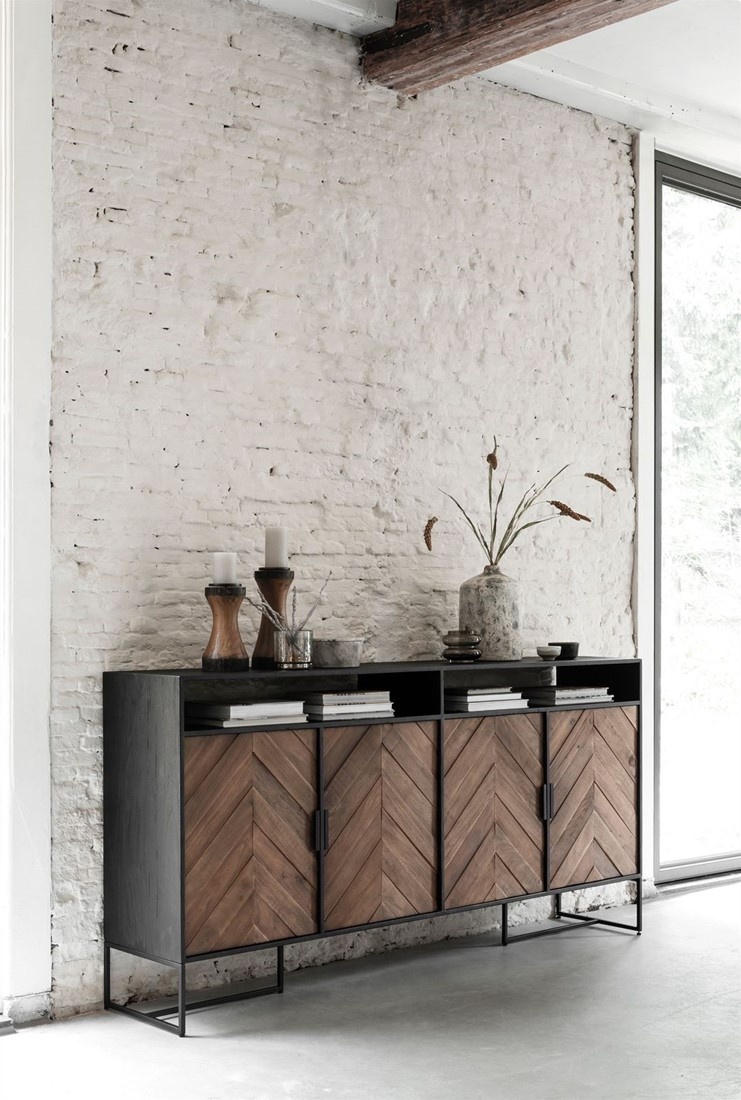 Het DTP Home Criss Cross dressoir is een stijlvol en karaktervol meubel dat direct opvalt door het unieke design. Het dressoir is gemaakt van gemixt hout in combinatie met stoere stalen details, wat zorgt voor een krachtige industriële uitstraling. Het hout is verwerkt in een opvallend visgraatpatroon, waardoor het meubel een luxe en speelse uitstraling krijgt.
