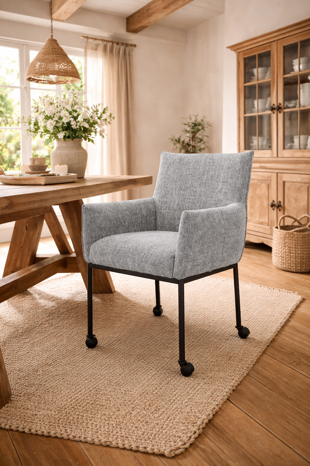 De comfortabele zitting, ondersteunende rugleuning en armleuningen zorgen voor een prettige zit. De geïntegreerde wieltjes maken de stoel extra gebruiksvriendelijk: eenvoudig aanschuiven, opstaan en verplaatsen zonder krassen op de vloer. Hierdoor is eetkamerstoel Lovi niet alleen stijlvol, maar ook zeer praktisch.