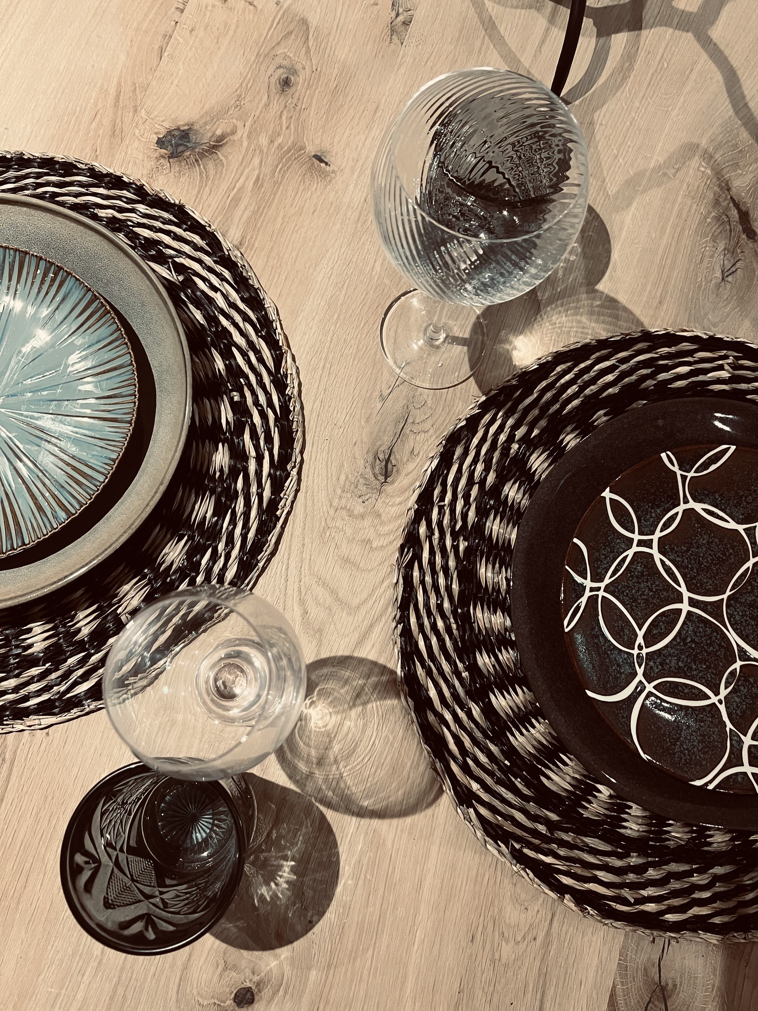 Deze tableware set bestaat uit 2 dinerborden, 2 dessertborden en zwart witte placemats met een leuk en vernieuwend design.